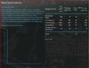 A progress bar, that runs from 0 to 100%, keeps the user updated about the current state of the neighborhoods in their project in terms of flood resilience. The indicator score is set to be inversely proportional to the fraction of flooded (i.e., exceeding threshold) to total built area (averaged over the neighborhoods present in the project). For instance, if on average 21% of the built area exceeds threshold, the score will be set to (100-21=) 79%. The user decides whether they whish to display the absolute or relative score. Naturally, a higher score means better flood resilience and vice versa.
