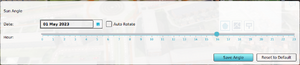 With the sun angle menu, the date and hour of day of your project can be adjusted. This in turn determines the location of the sun in the 3D visualization. Adjusting this setting allows your to visually inspects the shades created by spatial plans, such as wind mills and multi story buildings.